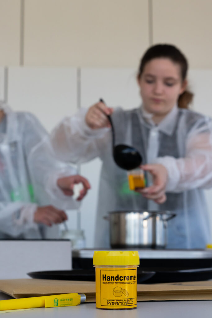 Doch zuvor wurden die Teilnehmerinnen mit Schutzkitteln und -brillen ausgestattet, damit Augen und Kleidung vor Spritzern geschützt sind. Nach Erhitzen, Mischen und Abfüllen, musste nur noch abgewartet werden, bis die cremige Masse aushärtet. Die Eigenkreation aus verschiedenen Bio-Ölen und Shea-Butter, durfte natürlich mit nach Hause genommen werden, ebenso wie Kugelschreiber, Blöcke, eine Schutzweste und ein Lanyard -natürlich in Häffner-Grün!