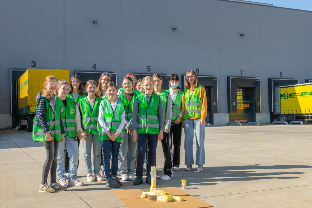 Rasch umgezogen und die Warnweste übergeworfen, ging es zum Live-Experiment an die frische Luft. Der spektakuläre Versuch mit dem lustigen Namen „Elefanten-Zahnpasta“ brachte die Teilnehmerinnen zum Staunen. Aus Sicherheitsgründen übernahm Auszubildende Marie die Durchführung mit Sicherheitsabstand zur Gruppe der Mädchen. Dass dieser mit Bedacht gewählt ist, zeigte der Versuchsverlauf deutlich. Mit einer überschäumenden